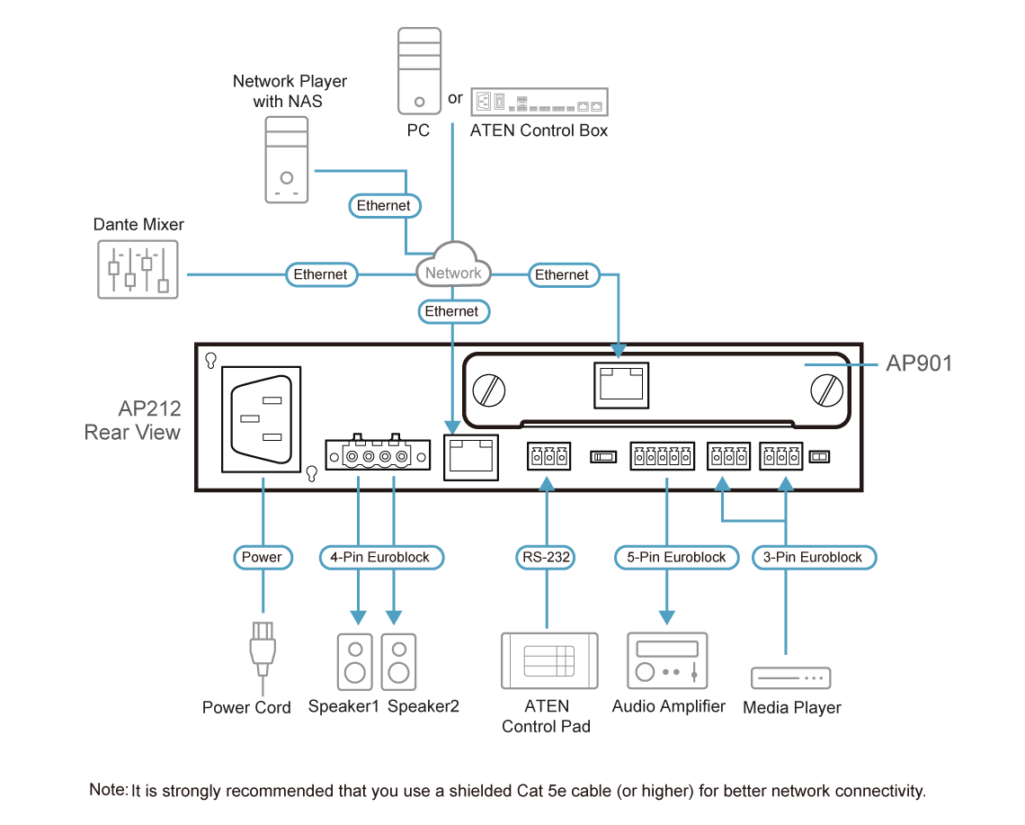 - Dedykowany do użytku z serią wzmacniaczy mocy AP DSP firmy ATEN