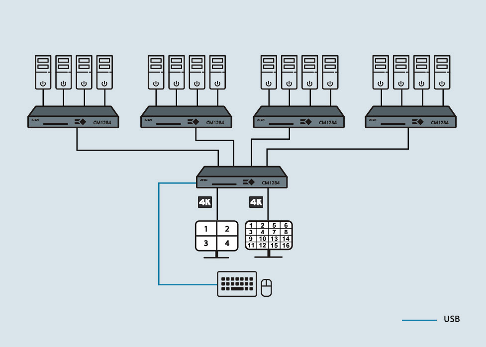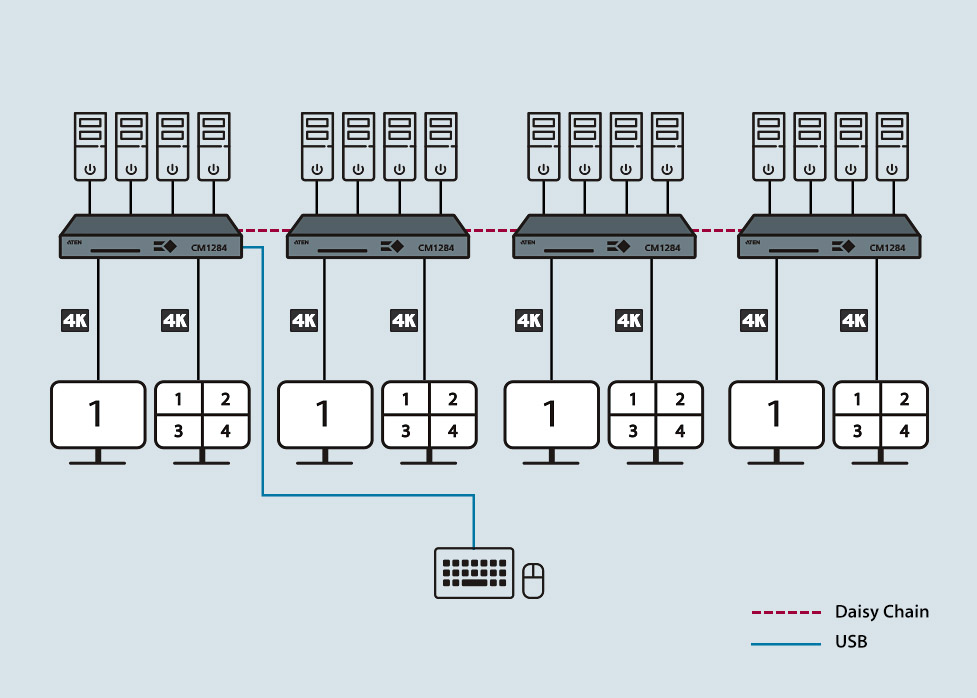 CM1284/CM1164A är konstruerad för att övervaka och hantera datorer med hög upplösning, och har intuitiv gränslös omkoppling så att du enkelt kan flytta musmarkören över fönsterkanter för att växla till och styra måldatorn. Särskilt lämplig för kontrollrum, övervakningscentra och centra för efterproduktion.