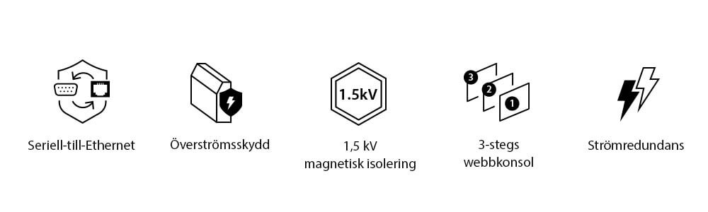 - Standarddriftlägen – Real COM, TCP Server/Client, Serial Tunneling Server/Client, UDP, Console Management (Telnet), och Console Management Direct (Telnet)