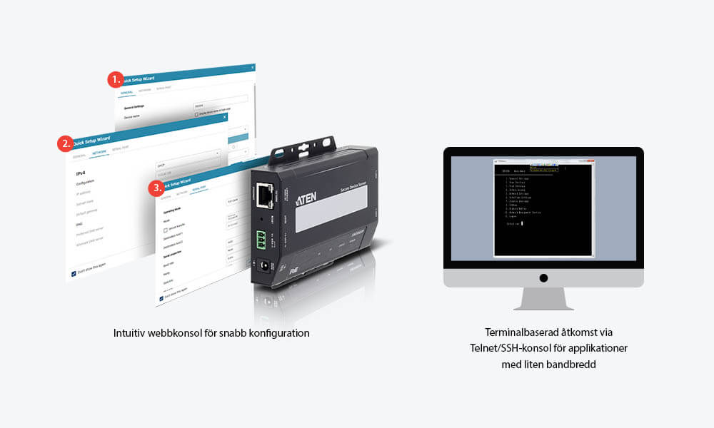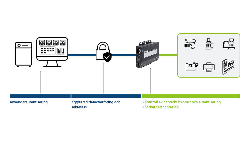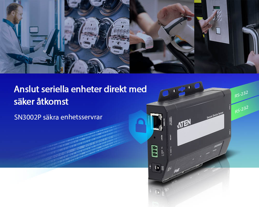 ATEN SN3000-serien med säkra enhetsservrar består av externa IP-baserade nätverksenheter för säker anslutning av äldre seriella RS-232-enheter till Ethernet-nätverk för fjärråtkomst från en dator på valfri plats. Det här möjliggör tillägg av fler serieportar för en värddator över ett nätverk.