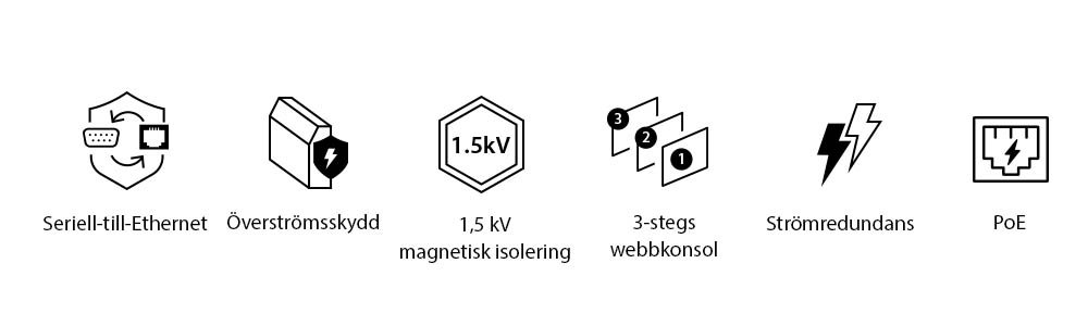 - Standarddriftlägen – Real COM, TCP Server/Client, Serial Tunneling Server/Client, UDP, Console Management (Telnet), och Console Management Direct (Telnet)
