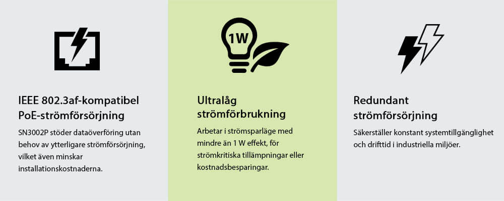 - Extra strömingång (uttag och kopplingsplint) för felsäker kraft; IEEE 802.3af-kompatibel PoE-utrustning