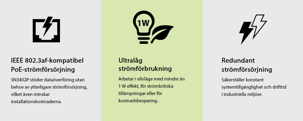 - Extra strömingång (uttag och kopplingsplint) för felsäker kraft; IEEE 802.3af-kompatibel PoE PD-utrustning (powered device)