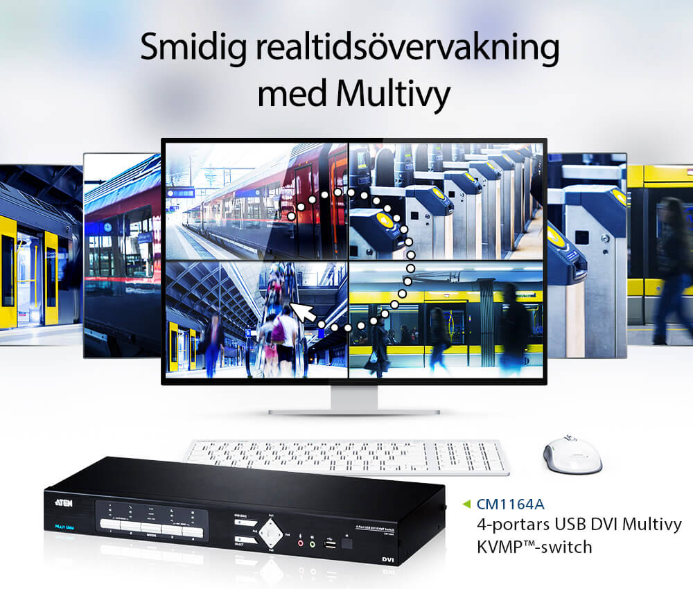 ATEN USB DVI Multi-View KVMP™ switch CM1164A med 4 portar höjer effektiviteten för intensiva övervakningstillämpningar. Det går att välja, växla mellan och visa upp till 16 videokällor samtidigt genom oberoende tangentbord och muskontroll vid begränsat skärmutrymme för att låta användare hantera data mer effektivt.