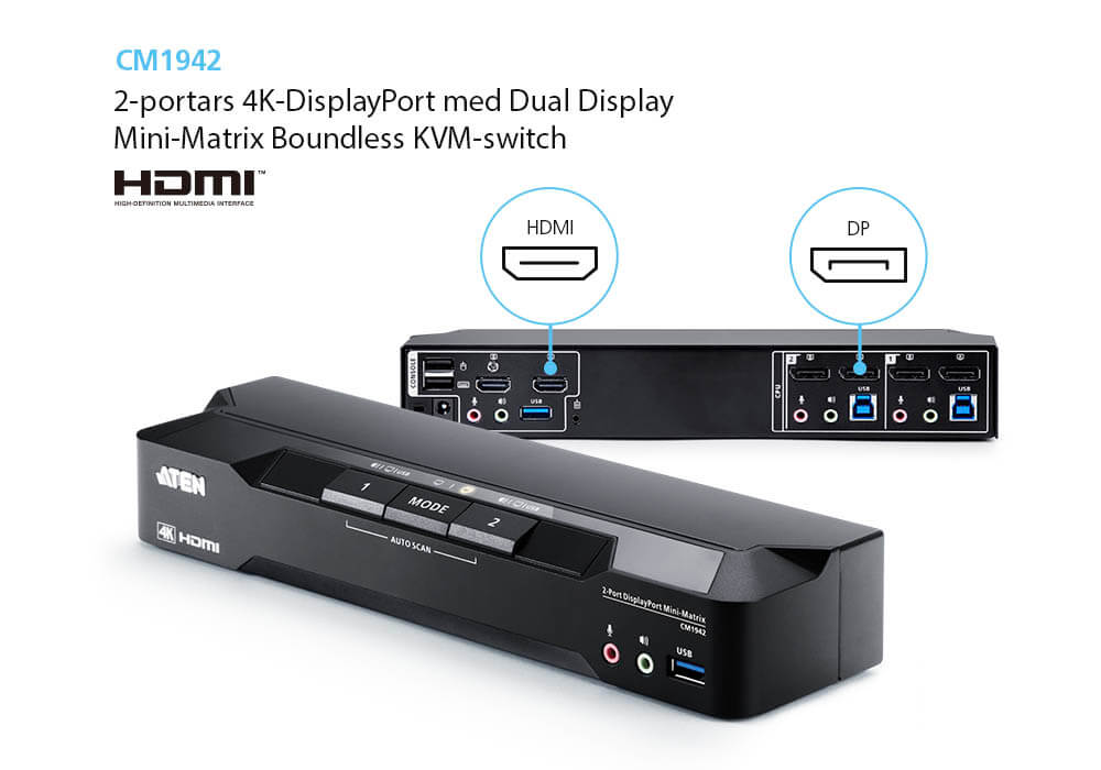 - 1 x CM1942 med 2-portars 4K-DisplayPort med Dual Display Mini-Matrix Boundless KVM-switch
