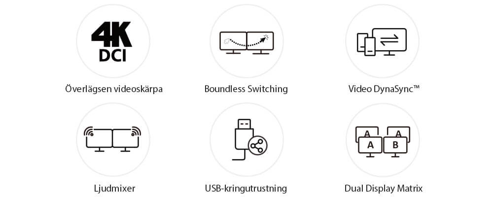 - Boundless Switching – gör att muspekaren kan röra sig utanför skärmkanterna för snabb växling mellan olika video- källor