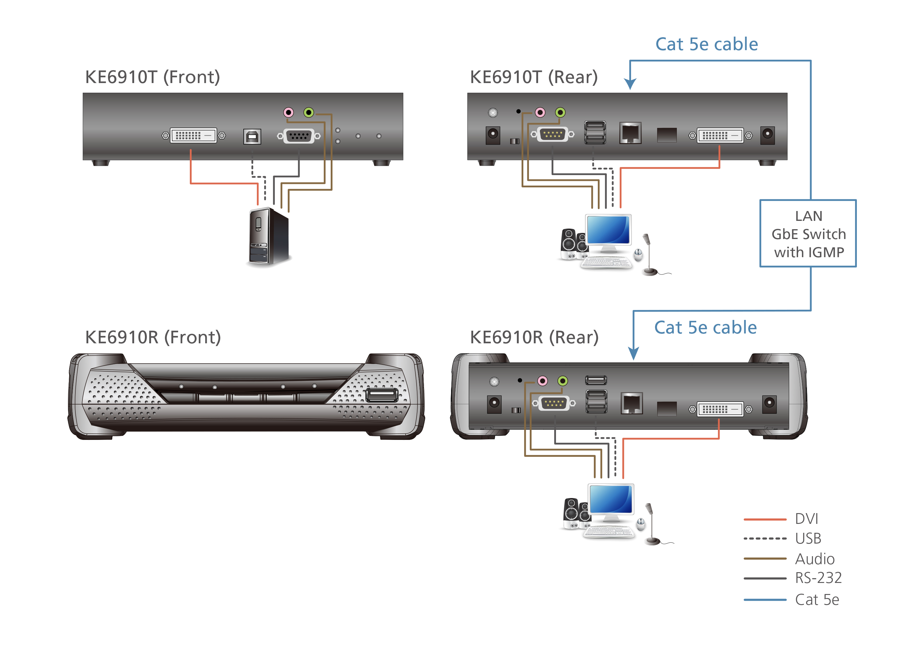 2K DVI-D Dual Link KVM över IP-extendern KE6910 utgörs av en högpresterande IP-baserad sändare (KE6910T) som ansluts till datorn, och en mottagare (KE6910R) som ger konsolåtkomst från en separat plats. KE6910 ger åtkomst till ett datorsystem från en USB-fjärrkonsol (USB-tangentbord, USB-mus, DVI-bildskärm) över ett intranät, vilket gör det möjligt för användare att lokalisera datorer i en säker och temperaturkontrollerad miljö, som är isolerad från användarnas arbetsstationer.
