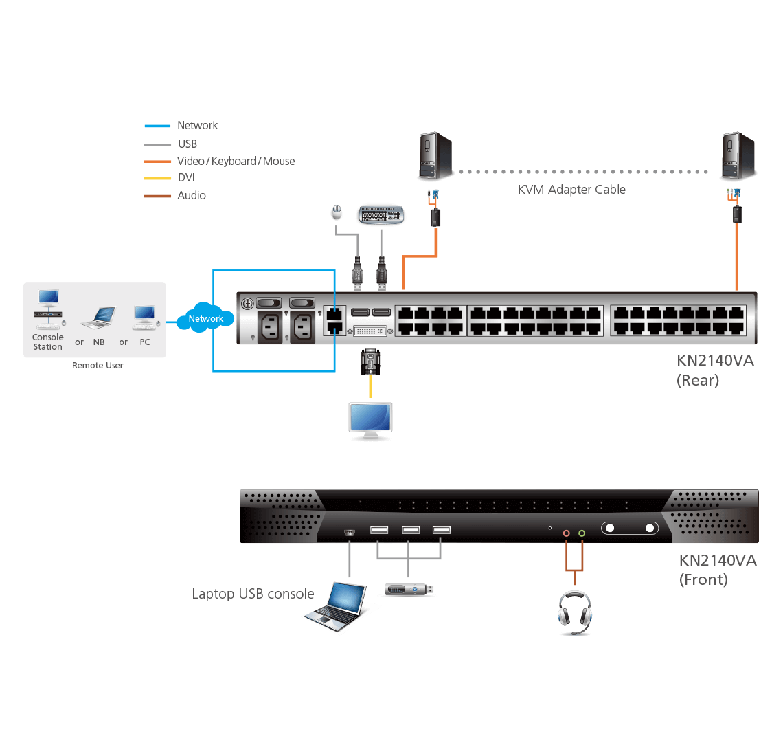 KN-serien tillhandahåller en lokal konsol och fjärråtkomst över IP för användare som behöver övervaka och komma åt hela datacentralen över ett nätverk.