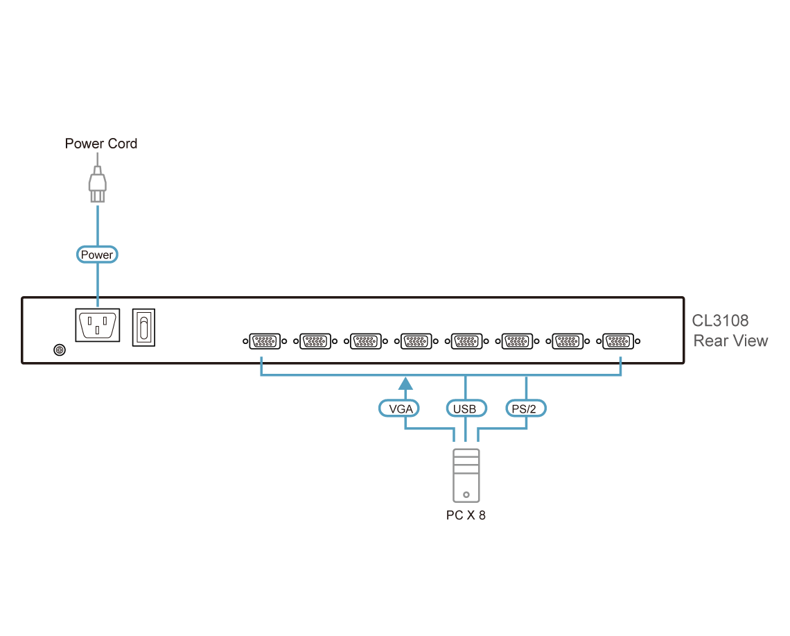 - Kaskadkopplingsbar i 2 nivåer – CL3108 styr upp till 128 datorer från en enda konsol (med kompatibla KVM-switch) CS1308/CS1316)