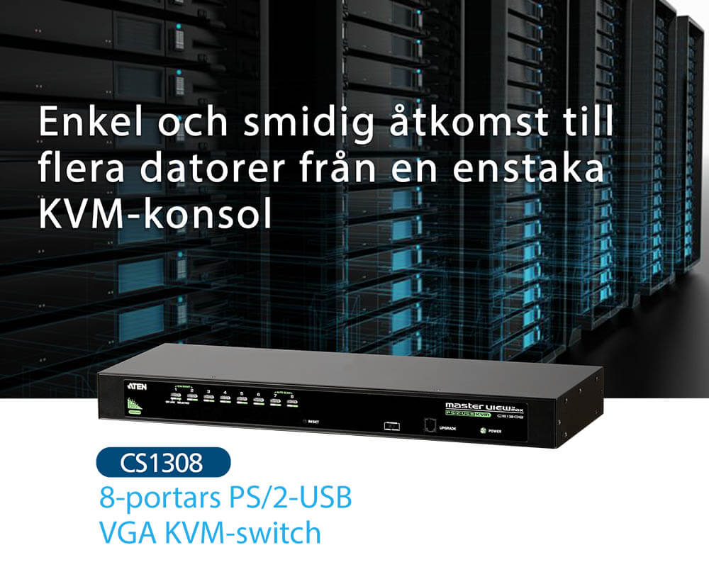 CS1308 är en USB-PS/2 KVM-switch (dubbelt gränssnitt) med 8 portar. Du kan styra upp till 64 datorer från en enda konsol (tangentbord, mus och bildskärm).
