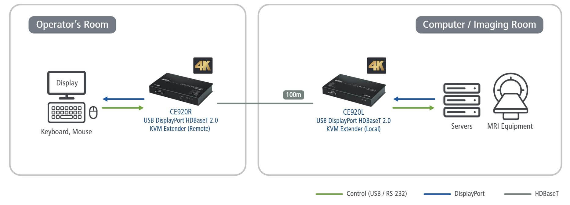 Genom att använda ATEN:s CE920 USB DisplayPort HDBaseT 2.0 KVM-extenders kan MRI-utrustning nås och styras med 100 % överföring utan latens samtidigt som okomprimerad video med pixel-till-pixel-kvalitet levereras pålitligt över 100 meter till operatörsrummet för diagnos i realtid. Det är dessutom lätt att ansluta den enda kabeln.