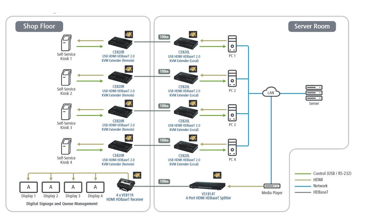 ATEN:s USB HDMI HDBaseT 2.0 KVM-extenders, som stödjer pek- och betalningsgränssnitt, tillåter flexibel placering av självbetjäningskiosker på butiksgolv samtidigt som de förlängs till datorer i ett säkert rum. Integration med ett digitalt skyltningssystem för distribution av interaktivt innehåll spritt över flera platser i butiken. Den exklusiva LockPro-designen från ATEN gör dessutom systemet säkrare och stabilare genom säker förankring av HDMI-anslutningen för att förhindra att den lossnar oavsiktligt.
