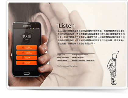 素有工業設計界奧斯卡美譽的『德國紅點設計獎』(red dot award)於日前公布 2012 red dot award 評審結果,宏正自動科技與台灣科技大學協同開發的聽障者智慧溝通軟體- iListen,勇奪 red dot Communication Design 2012 獎項,其多項專為聽障者設計的創意輔助溝通功能,以及直覺可親的操作介面設計,獲得專業評審團的高度青睞。iListen 繼今年 4 月獲得 Samsung 創意應用程式開發大賽(Apps Contest)冠軍,再度榮獲國際知名大獎肯定,以具體成果為聽障者創造便利溝通的新契機。