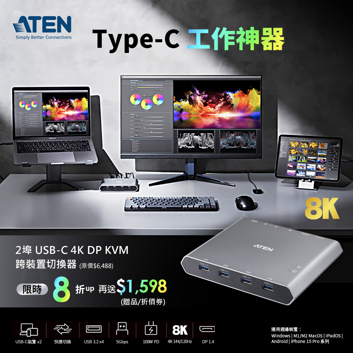 優惠最後倒數!宏正USB-C 4K DP KVM 跨裝置切換器限時8折