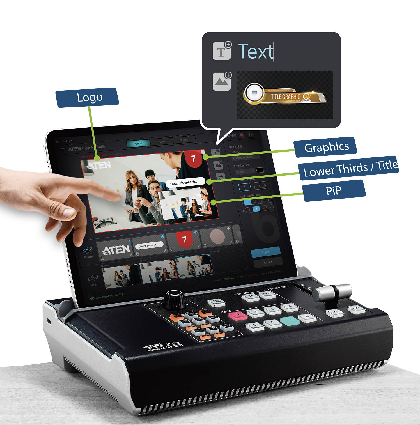 ATEN OnAir Lite 控制 App,可讓您遠端操控、即時編輯、色鍵去背,安排多種製作要件至您的編程組合中。您可切換並混合視訊/音訊,變更設定與特效,儲存多達 8 組預設場景以快速切換。即將推出的新功能將可用於聊天、動畫及音效的快捷鍵,一切都有助簡化您的工作流程。