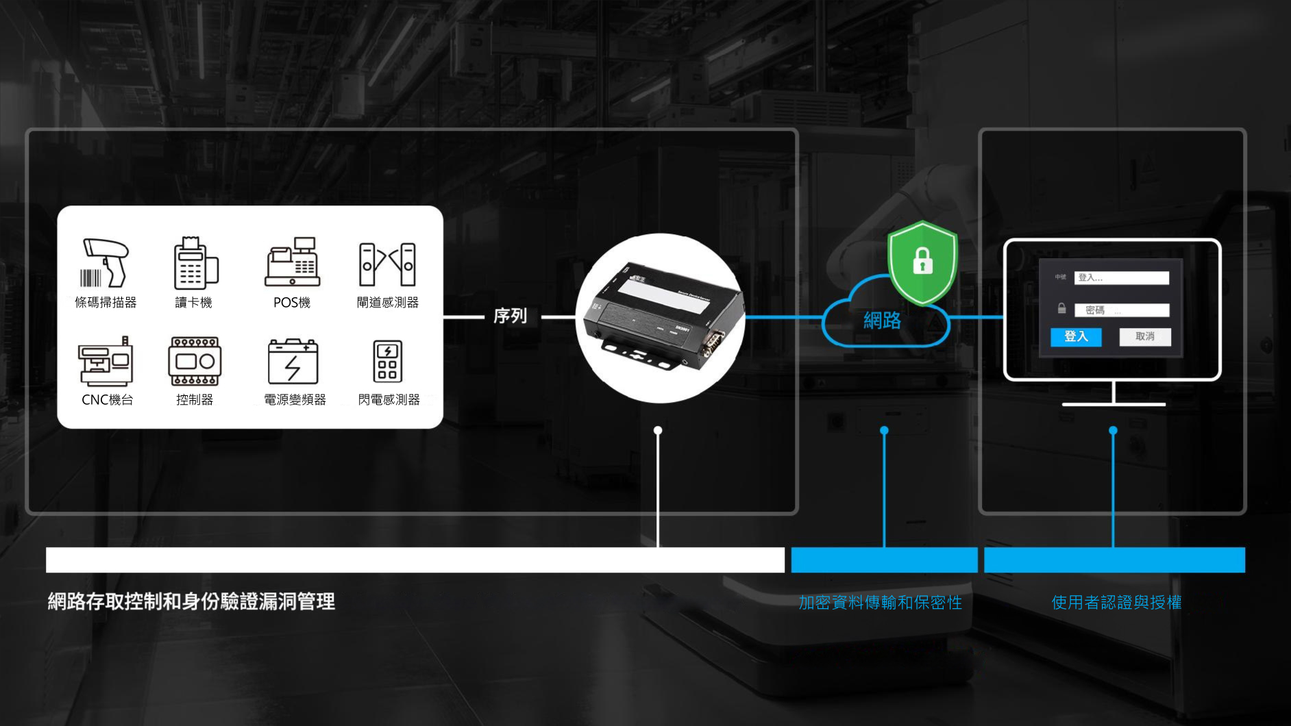 工業物聯網領域的網路攻擊日益猖獗,為了抵禦潛藏的資安漏洞,SN 系列安全序列設備伺服器立起強大的防護罩,廣設於系統的各個層區,包括網路存取控制與授權、用戶身份驗證、資料完整性與資料加密等。徹底而嚴謹地重重把關,確保所有資訊都能安全傳輸。