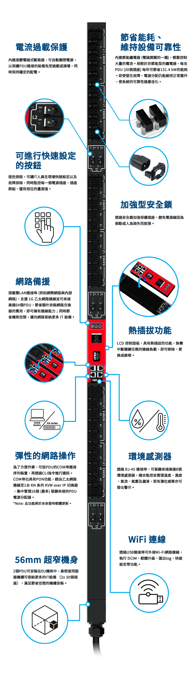 支援網路備援,由LAN埠串接多達64個PDU,大量節省安裝網路交換器的費用;同時節省機櫃空間,在擴充的網路下容納更多 IT 設備。