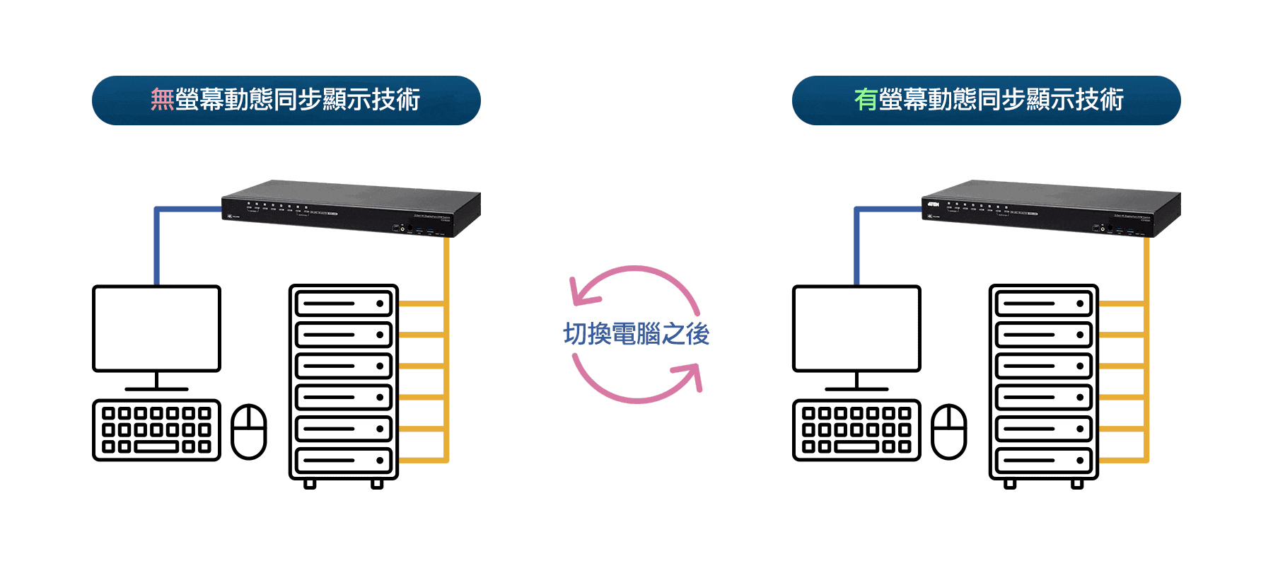 搭載ATEN專利技術-螢幕動態同步顯示Video DynaSync™,機架式KVM多電腦切換器,在不同連接埠做切換時,可維持最佳的影像。傳遞順暢的觀看體驗,加快系統間的切換速度、持續提供螢幕電源供應,以減少啟動顯示器時會產生的問題。