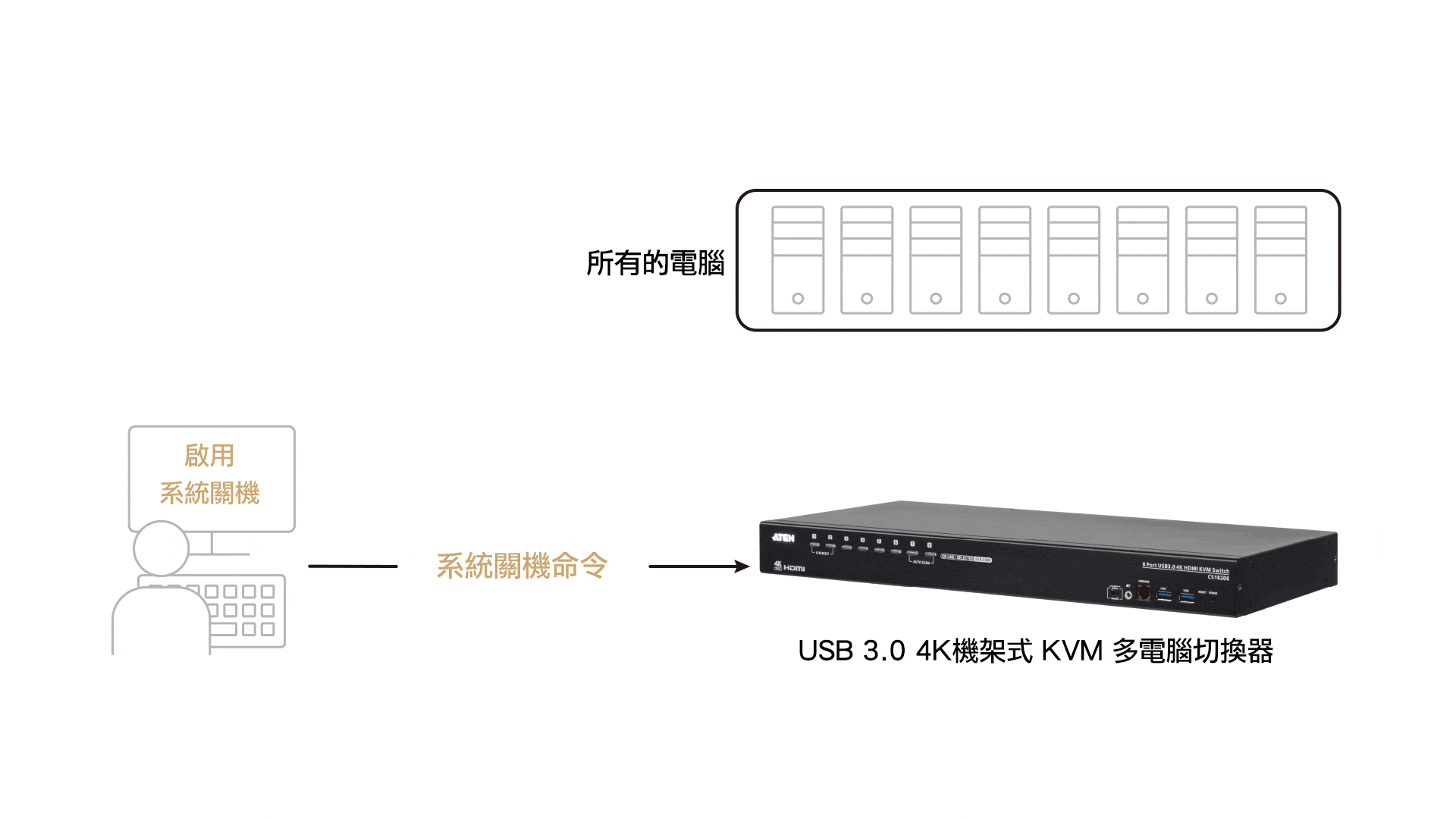 ATEN USB 3.0 4K機架式KVM多電腦切換器 (CS18208 / CS18216 / CS19208 / CS19216),具備4K畫質、高速USB 3.0、以及節省空間的機架式安裝等特色;透過單一控制器集中控制8或16台電腦,IT工程師可同時對多台電腦設定多個指令加速系統運作,而非一次只能控制一台電腦。因此,例行或是重複性的任務與流程,可立即在數秒內被快速複製,並傳送到多台電腦上,以節省時間、空間及成本,同時提高企業產能。