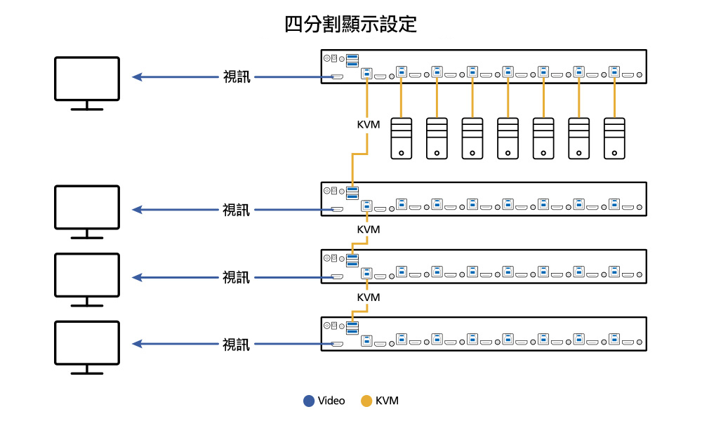 當需要立即觀看大量複雜的資訊內容,或需要檢視密集型資料以執行分析時,最多可使用8台機架式KVM切換器,設定8台螢幕達成多重顯示設置 (雙顯示/三顯示/四顯示),於控制台桌面可加速檢視不同電腦的影像。