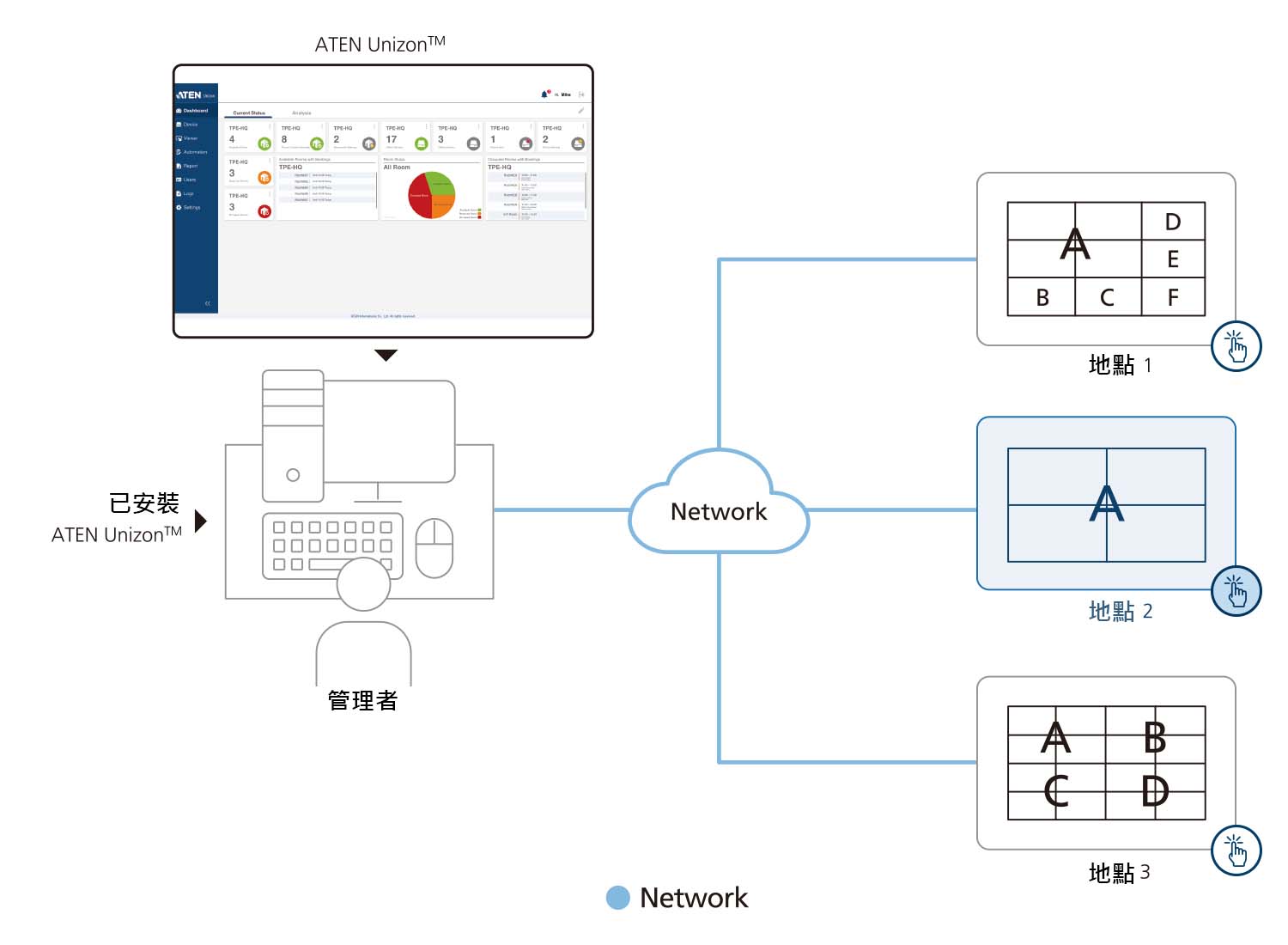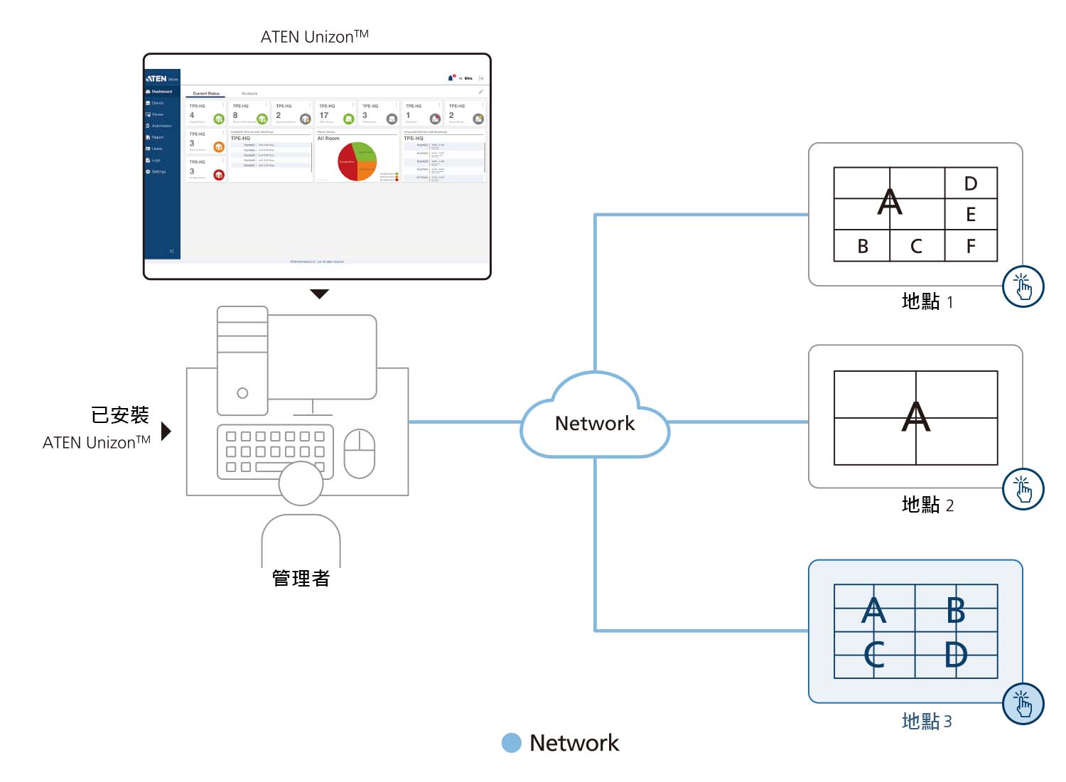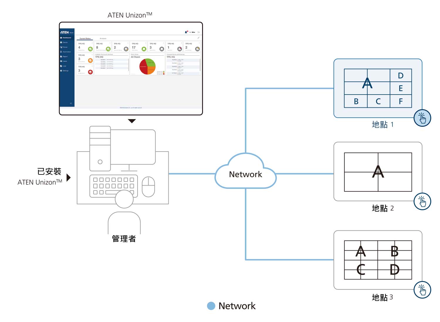 ATEN Unizon™ 為一個集中管理平台,符合任何ATEN產品相互搭配的需求與應用,包含ATEN矩陣式影音切換器、ATEN控制主機、ATEN會議室預約系統,全部都能自訂以滿足需求。