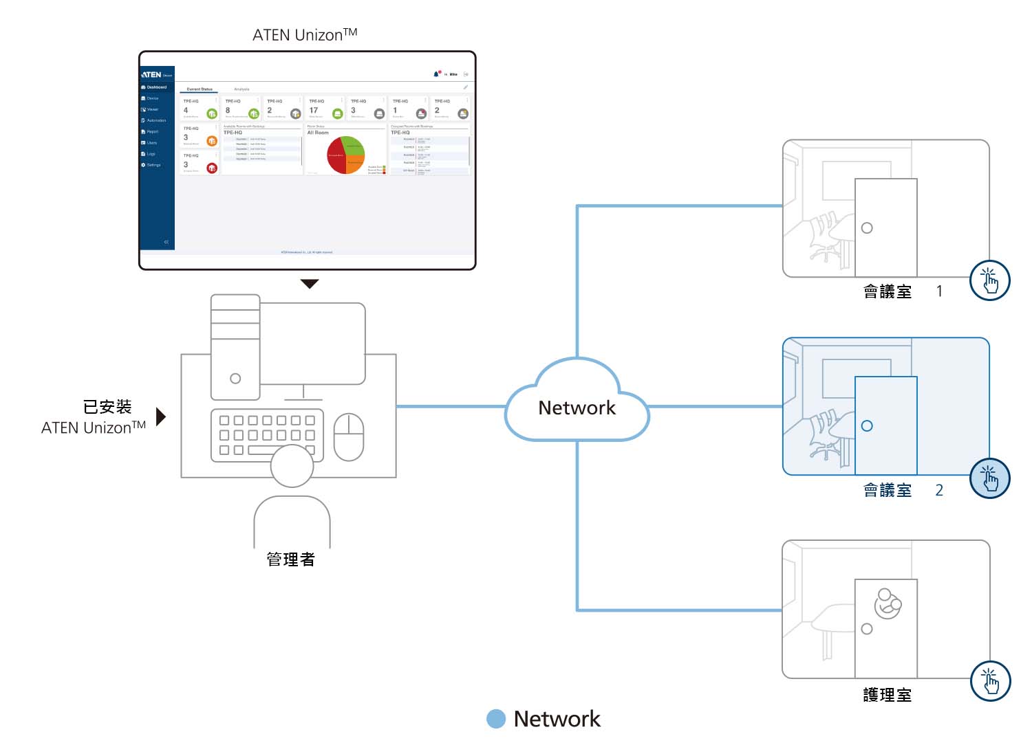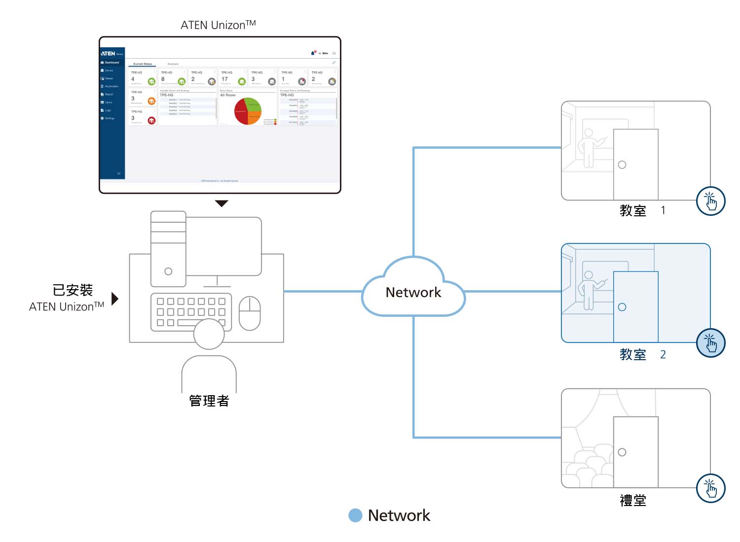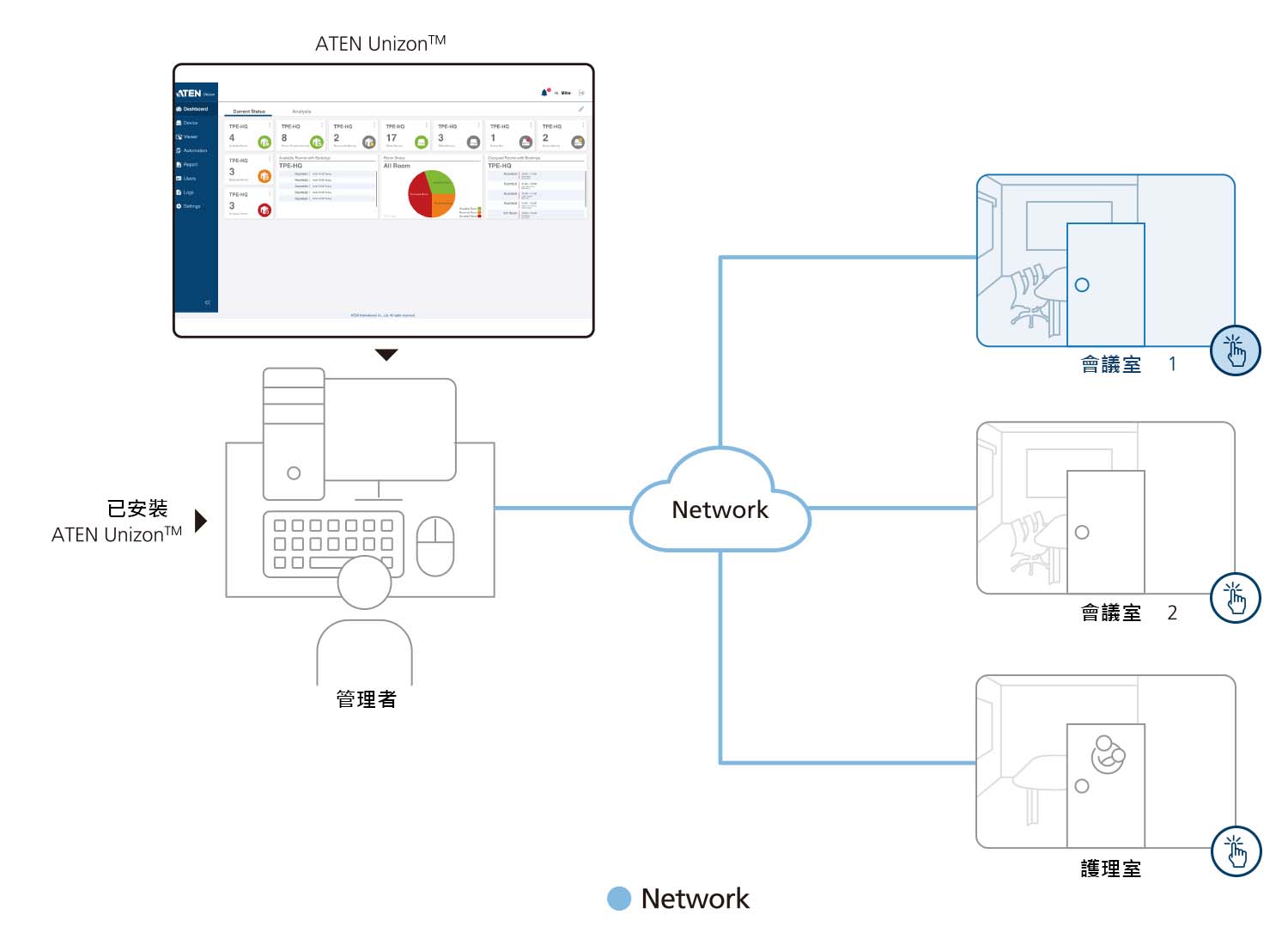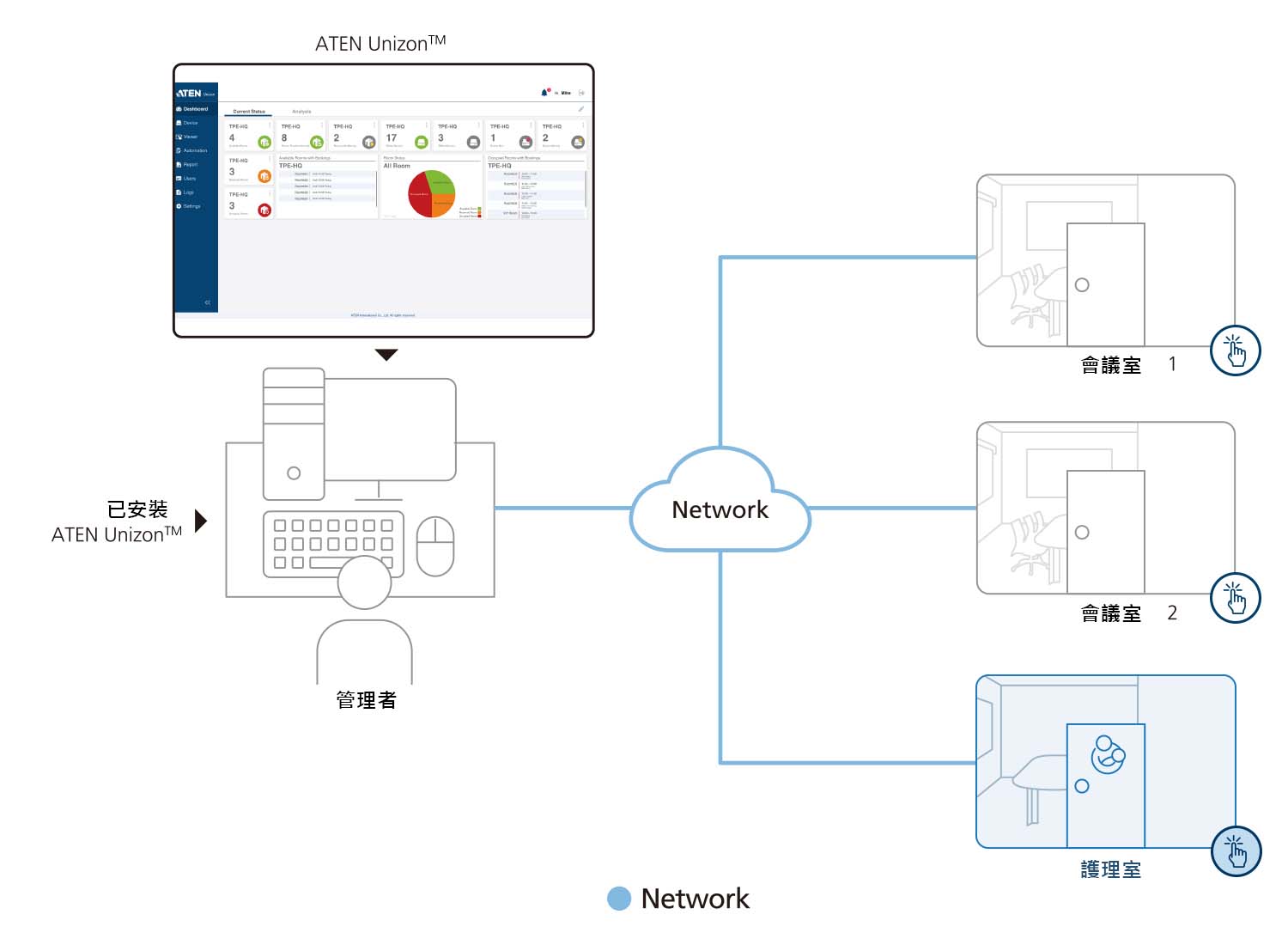 ATEN Unizon™ 為一個集中管理平台,符合任何ATEN產品相互搭配的需求與應用,包含ATEN矩陣式影音切換器、ATEN控制主機、ATEN會議室預約系統,全部都能自訂以滿足需求。