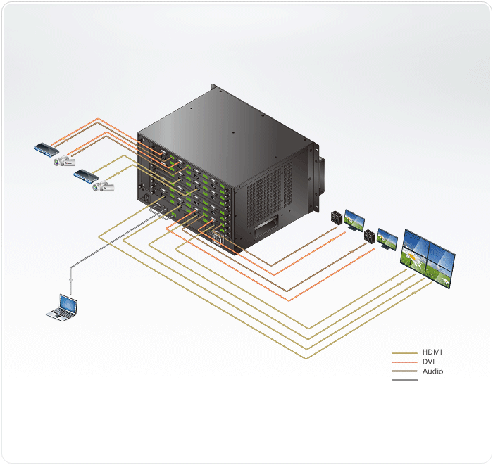 - 連接任何16組視訊來源及任何16組顯示裝置,透過ATEN模組化矩陣式影音解決方案輕鬆整合