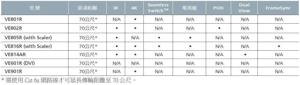 | 最大距離 | HDMI:最長 15 m HDBaseT (Class B):4K 最長 35 m (Cat 5e/6) / 40 m (Cat 6a); 1080p@60公尺(Cat 5e/6) / 70公尺(Cat 6a) |