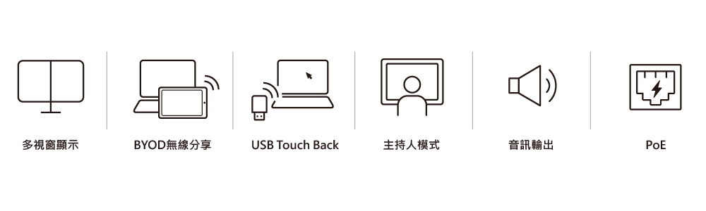 - USB touchback功能 – 使用者可透過連接的觸控螢幕或滑鼠直接操控簡報