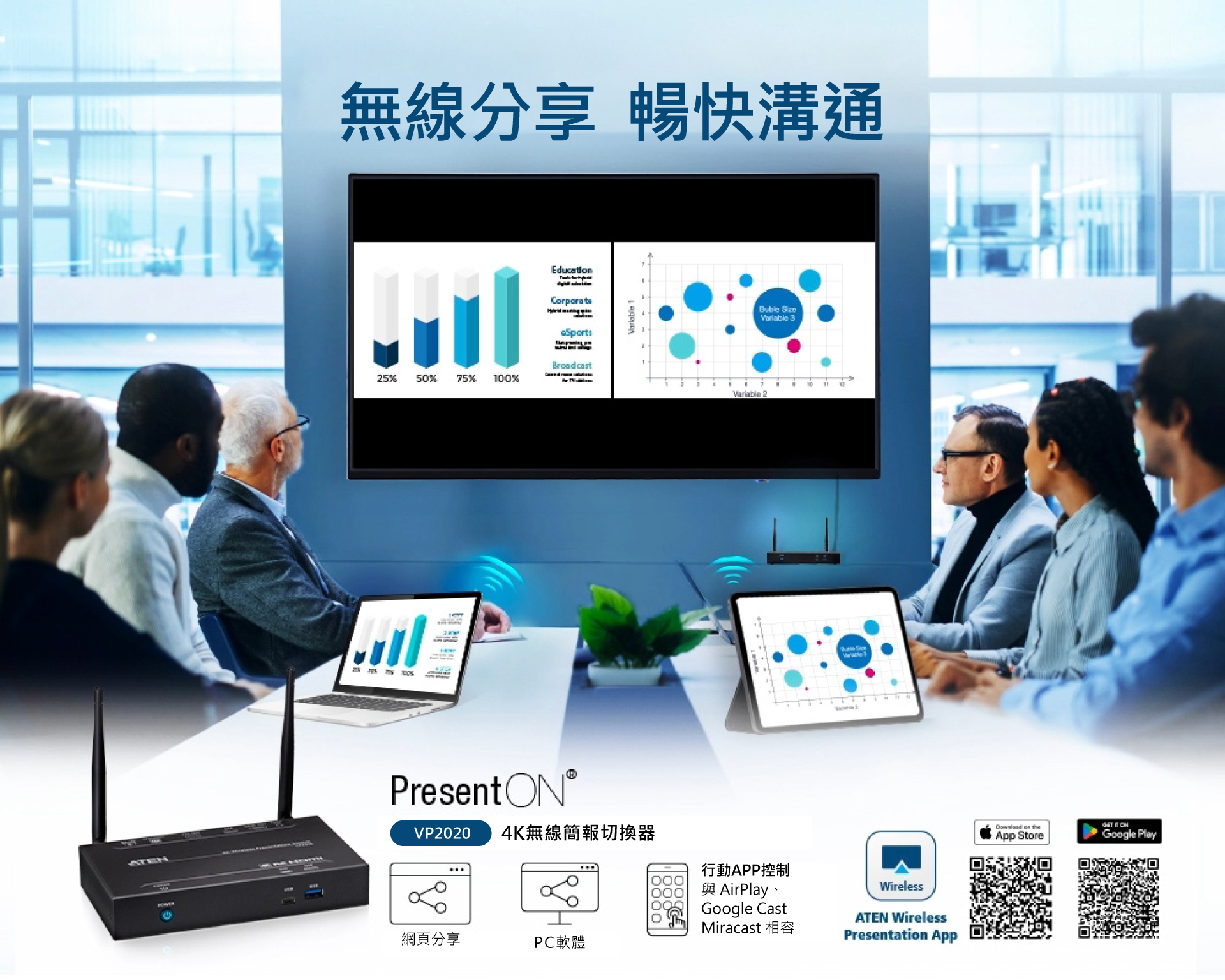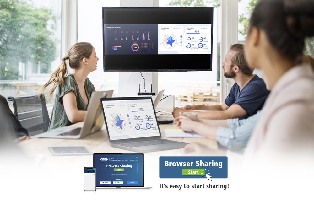 ATEN PresentON™ VP2020 無線 BYOD 解決方案,讓任何人隨手就能從筆電或行動裝置分享協作內容,提高工作效率。
