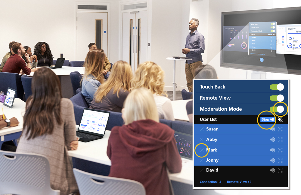 開啟 ATEN Presentation App 的「主持人模式」後,簡報者可輕鬆管理分享內容,包括關閉聲音、停止分享,或在需要時移除連線。
