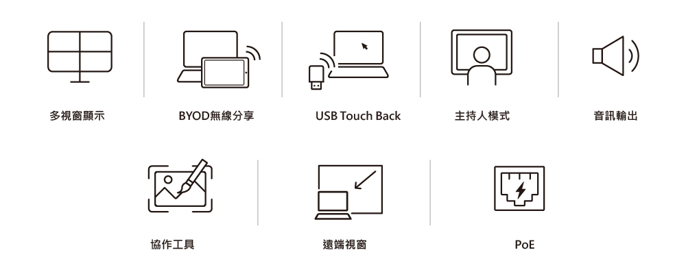 - USB touchback功能 – 使用者可透過連接的觸控螢幕或滑鼠直接操控簡報