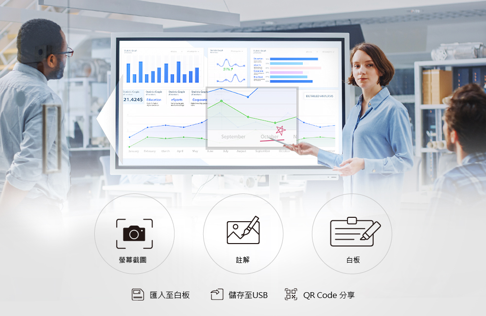 協作工具,讓團隊成員聚在一起討論、直接將想法投放在螢幕上、作註解,或截圖做紀錄,提升團隊溝通效率。