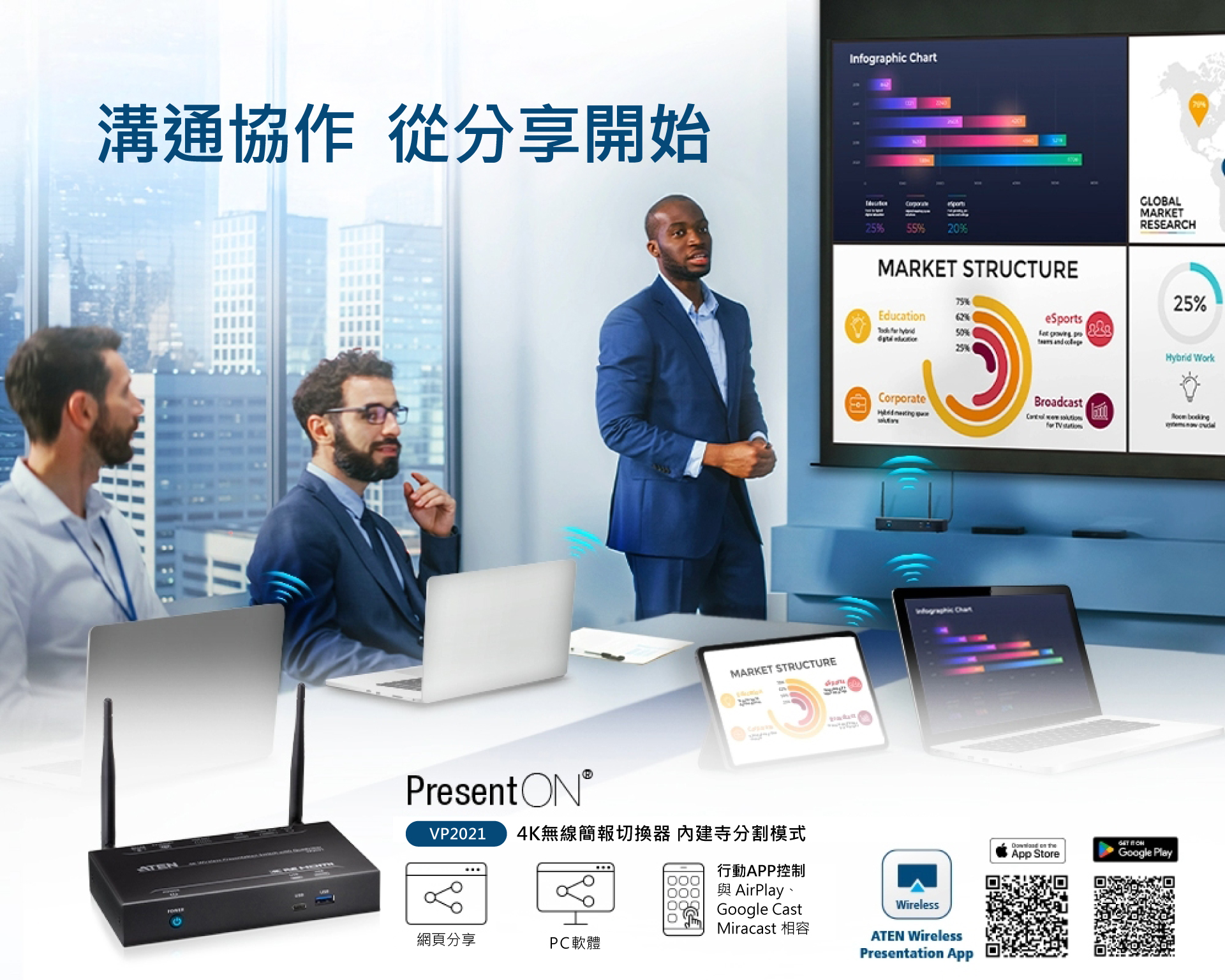 ATEN PresentON™ VP2021無線BYOD解決方案,讓任何人隨手就能從筆電或行動裝置分享協作內容,提高工作效率。