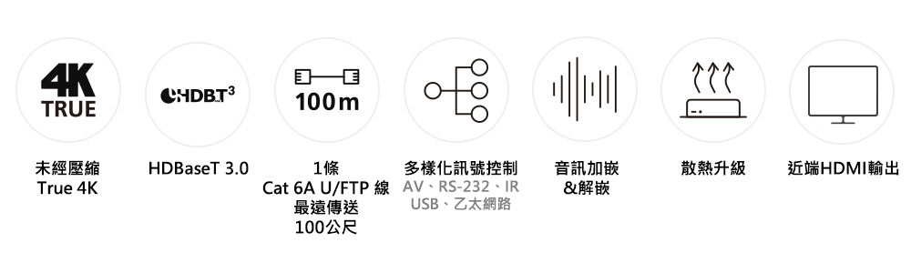 - 符合HDBaseT 3.0標準 – 傳輸高品質影音、全範圍IR、雙向RS-232、Gigabit乙太網路、獨立立體聲道及USB2.0訊號