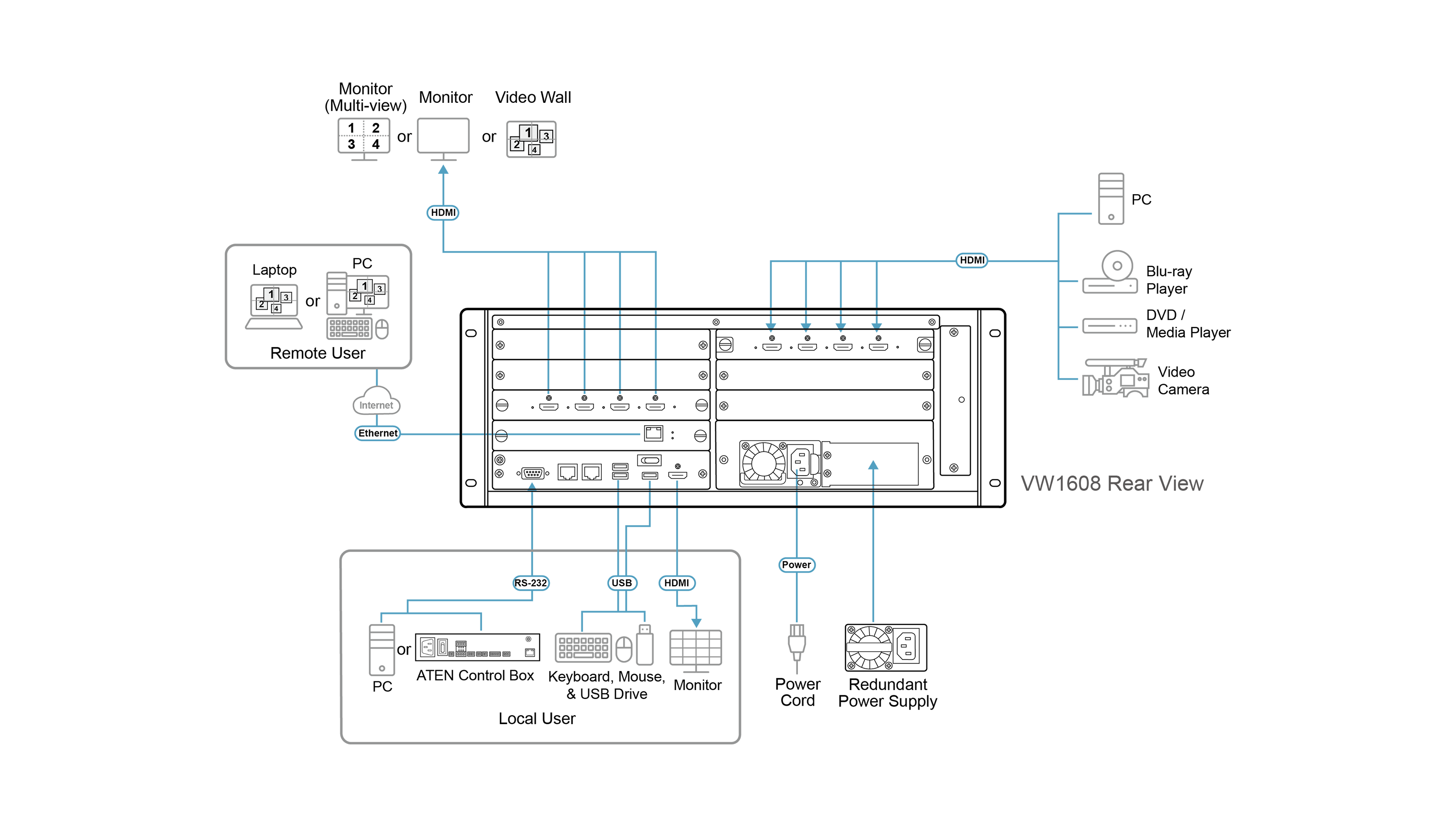 - 備援模式 – 當串接兩台VW1608時,次要(備援)設備會即時複製主機的所有系統設定與配置;當主機故障時,備援設備會自動接手顯示畫面輸出,確保顯示不中斷