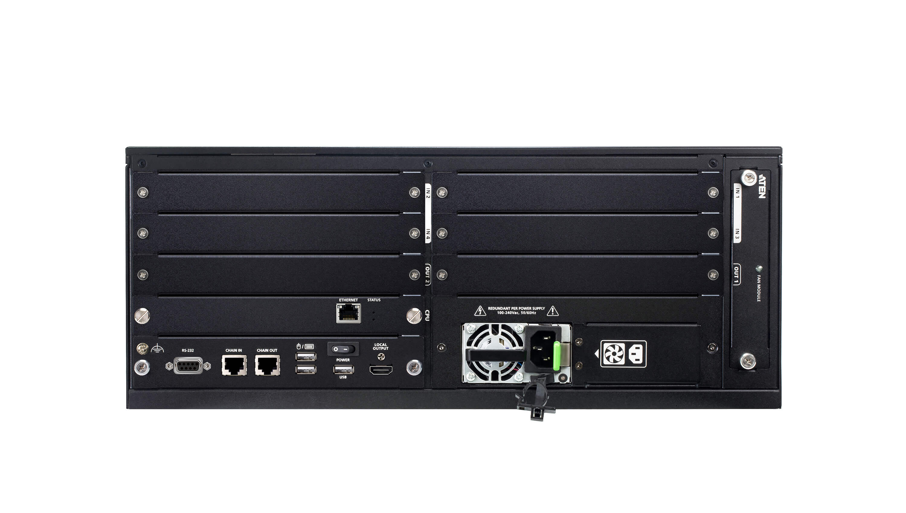 VW1608 採用 4U 機箱設計,提供 4 個輸入板卡插槽與 2 個輸出板卡插槽,可支援 16 組視訊來源與 8 台顯示器;而模組化的架構也便於擴充。此外,內建備援電源模組與可熱插拔散熱風扇模組,確保系統的最大可用性。