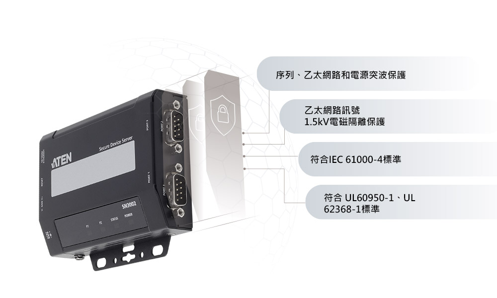 突波保護,是任何設備調節電氣防護不可或缺的裝置,確保系統安全運作。因此,SN3002安全串列設備伺服器,具備乙太網路訊號的1.5kV 電磁隔離保護、以及序列、乙太網路和電源的突波保護功能,防止電壓或電流在尖峰或運轉時突然上升。此外,符合工業安全標準、IEC 61000-4突波要求,確保系統穩定可靠。