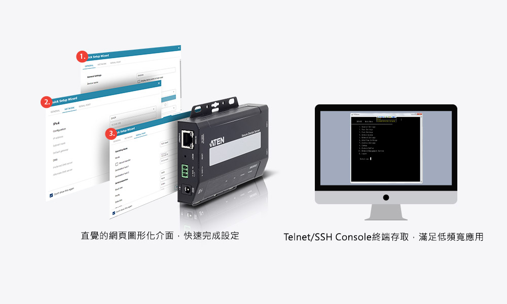 SN3002系列的網頁圖形化介面 (支援多國語言),只需3個步驟即可快速設定及控制裝置。設定既簡單又快速,使用者平均只需要花費一分鐘。此外,對於頻寬敏感型 (bandwidth-sensitive)的應用,Telnet/SSH Console 也可作為低頻寬解決方案。