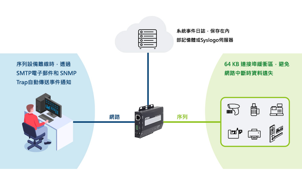 ATEN 了解資料遺失以及外洩的嚴重性。SN3002系列具有 64 KB 連接埠緩衝區,避免網路中斷時資料遺失;若序列設備因電源故障而離線或觸發使用者定義的錯誤,將會透過 SMTP電子郵件 和 SNMP Trap自動傳送事件通知。此外,系統事件日誌可用於記錄和追蹤操作的歷史紀錄,並可儲存在內部記憶體或 Syslog 伺服器,您可隨時擷取資料進行監控及故障排除。