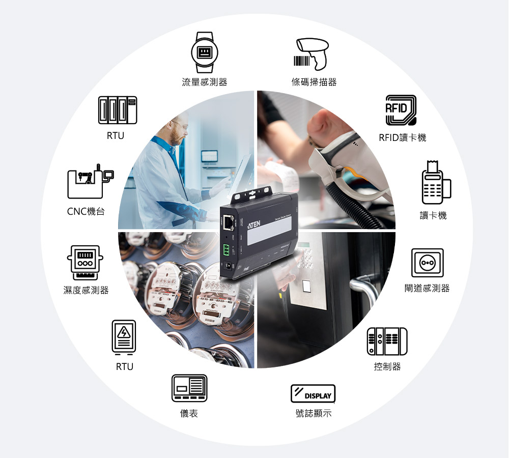SN3401P支援序列設備網路連線,適合應用在商業、工業製程自動化環境;包含POS、存取控制、SCADA 系統、環境監控、感應器監控、裝置管理、遠端管理等。