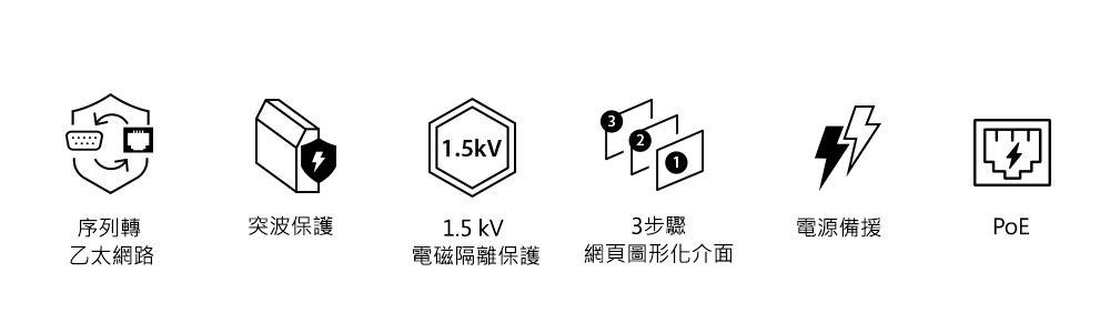 突波保護,是任何設備調節電氣防護不可或缺的裝置,確保系統安全運作。因此,SN3401P安全串列設備伺服器,具備乙太網路訊號的1.5kV 電磁隔離保護、以及序列、乙太網路和電源的突波保護功能,防止電壓或電流在尖峰或運轉時突然上升。此外,符合工業安全標準、IEC 61000-4突波要求,確保系統穩定可靠。