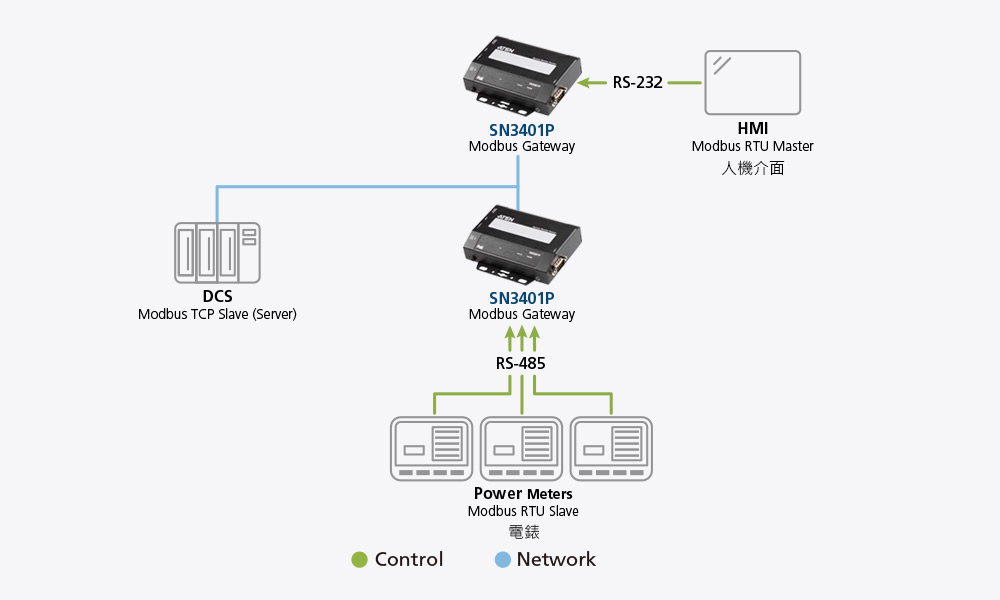 SN3401P可當 Modbus 閘道器,提供Modbus TCP與Modbus RTU / ASCII通訊協定之間的轉換,讓Modbus串列Slave設備可以無縫整合到現有Modbus TCP網路,且串列Master設備可存取Modbus TCP Slave設備。