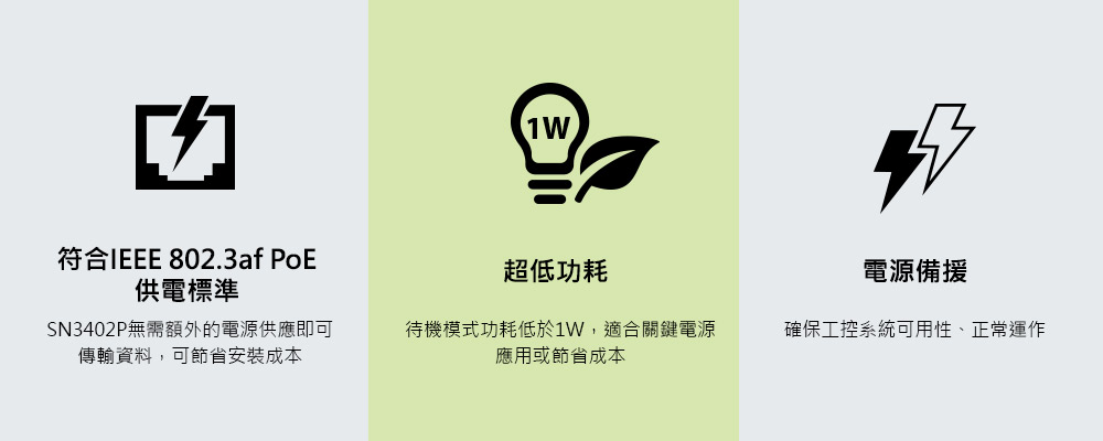 - 輸入電源備援機制 (電源插孔以及接地端子); IEEE 802.3af相容PoE PD受電設備
