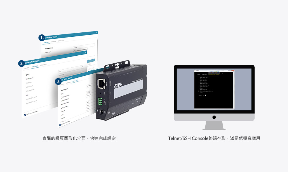 SN3401P網頁圖形化介面 (支援多國語言),只需3個步驟即可快速設定及控制裝置。設定既簡單又快速,使用者平均只需要花費一分鐘。此外,對於頻寬敏感型 (bandwidth-sensitive)的應用,Telnet/SSH Console 也可作為低頻寬解決方案。