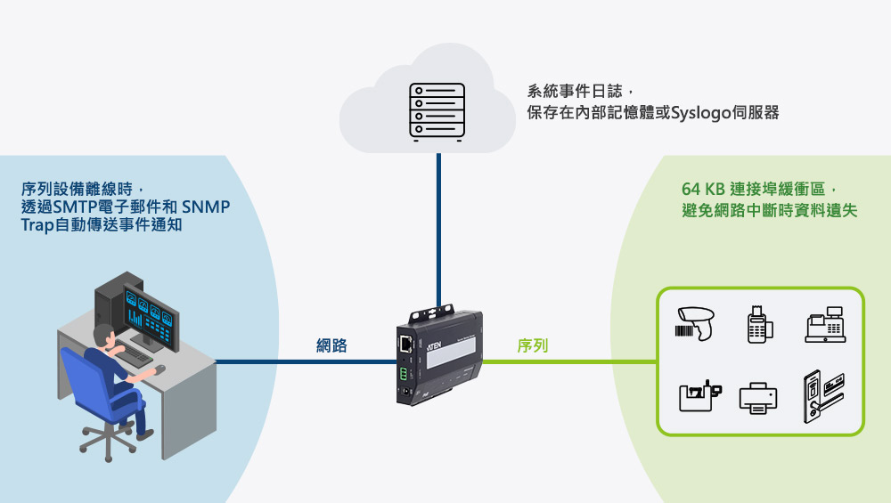 ATEN 了解資料遺失以及外洩的嚴重性。SN3401P具有64 KB連接埠緩衝區,避免網路中斷時資料遺失;若序列設備因電源故障而離線或觸發使用者定義的錯誤,將會透過SMTP電子郵件和SNMP Trap自動傳送事件通知。此外,系統事件日誌可用於記錄和追蹤操作的歷史紀錄,並可儲存在內部記憶體或 Syslog 伺服器,您可隨時擷取資料進行監控及故障排除。