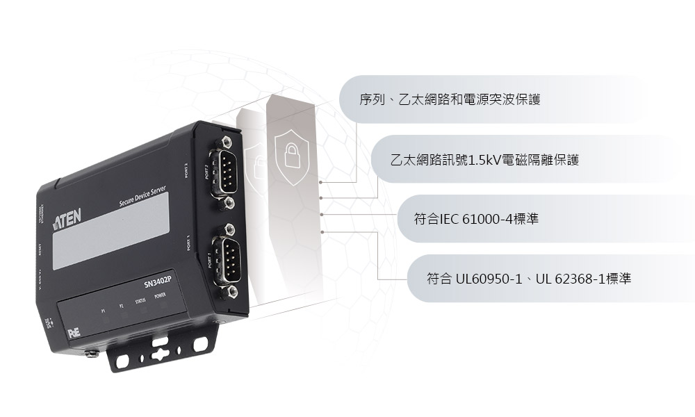 方便、安全可靠的解決方案,讓您更輕鬆將各種序列設備連接至IP型乙太網路。ATEN SN3402P安全串列設備伺服器,具有簡單又快速的序列轉乙太網路連網功能,讓使用者從電腦,即可遠端存取RS-232/ 422 / 485序列設備。SN3402P解決方案,非常適合商業和工控應用。