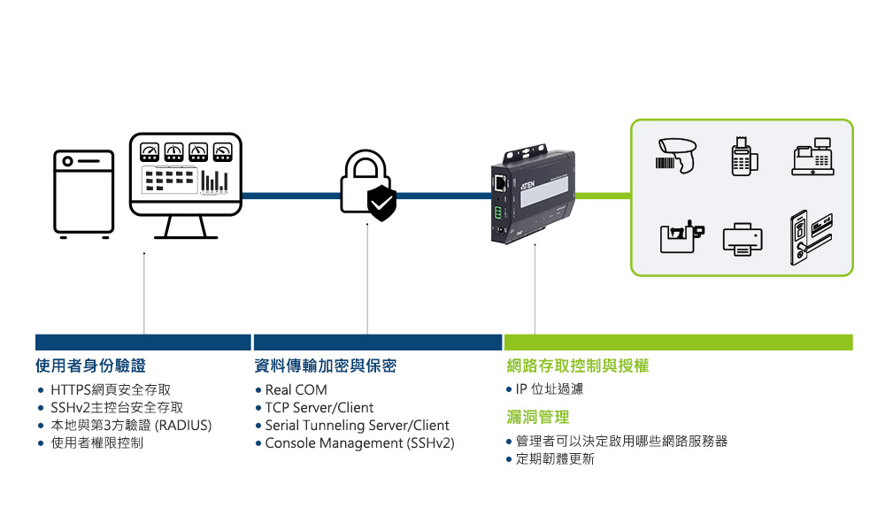ATEN SN3402P安全串口設備連網伺服器,可將傳統RS-232/422/485序列設備安全地連接到乙太網路上的網路設備,讓電腦能從任何地方進行遠端存取,並可透過網路擴充主機的序列連接埠數量。SN3402P尤其適合工業控制應用。它能提供序列和網路訊號間的雙向轉換,進而透過網路收集近端及遠端序列設備的資料。例如:廣泛運用在工控環境的資料採集及監控系統 (SCADA),能收集SN3402P設備序列埠所接的可程式化邏輯控制器 (PLC)、量測器和感測器數據。