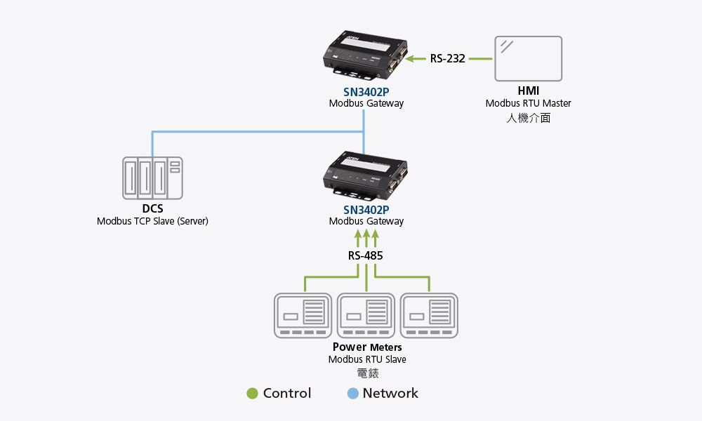 SN3402P可當 Modbus 閘道器,提供Modbus TCP與Modbus RTU / ASCII通訊協定之間的轉換,讓Modbus串列Slave設備可以無縫整合到現有Modbus TCP網路,且串列Master設備可存取Modbus TCP Slave設備。