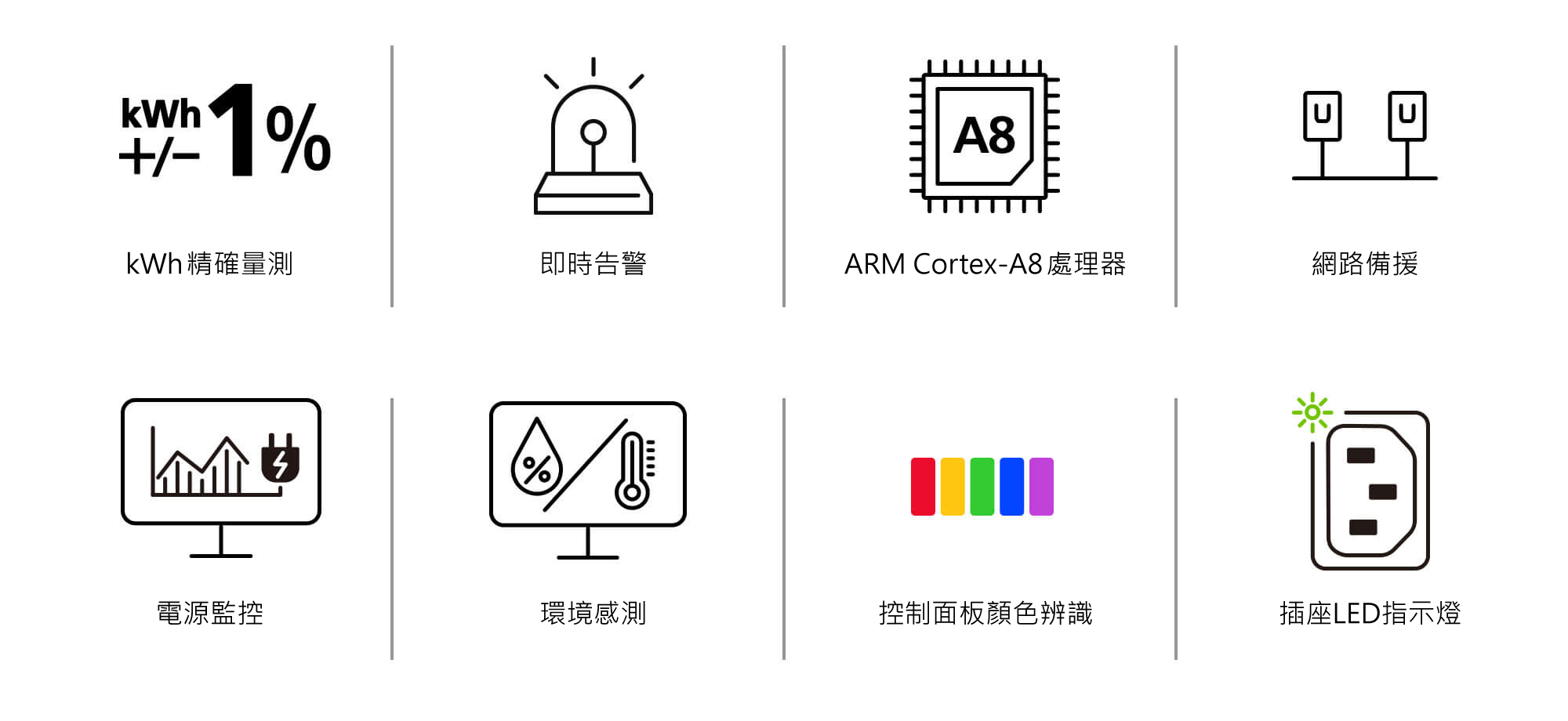 - 支援電流、電壓、電力、電耗、溫度、及濕度量測與閥值設定